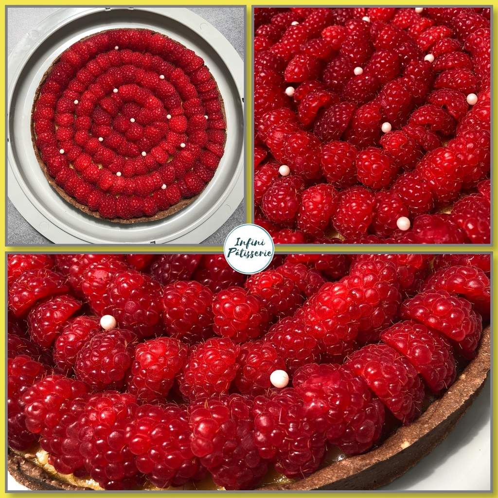 - Coupez les framboises en 2 et disposez les en cercle. Décorez selon vos goûts et servir frais.